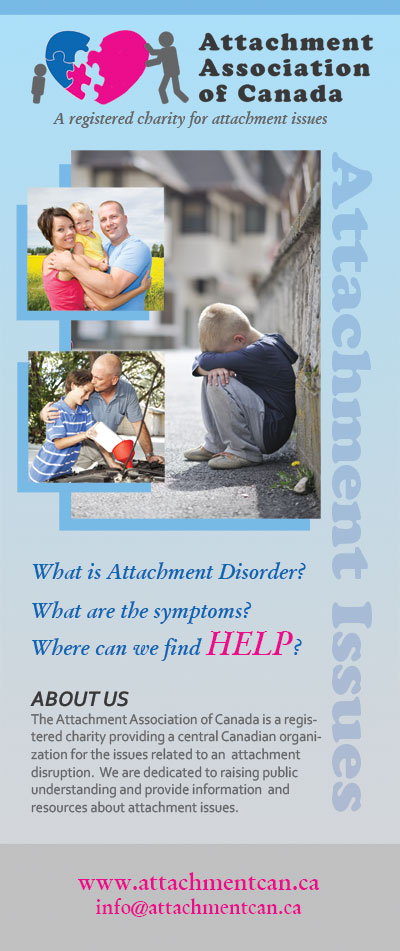 Attachment Association of Canada is a registered charity providing a central Canadian organization for the issue of attachment disorder. They are dedicated to raising the public understanding and awareness of attachment issues. They provide information and resources about attachment and trauma. They are working to create support networks for parents in as many communities as possible across the country. They are helping more therapists in Canada become qualified in this area so that they can provide services in their local communities. They are working to provide services and education to families and individuals dealing with the attachment issues.