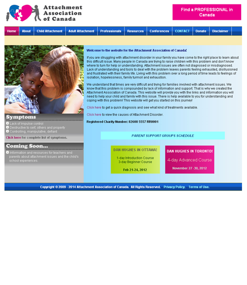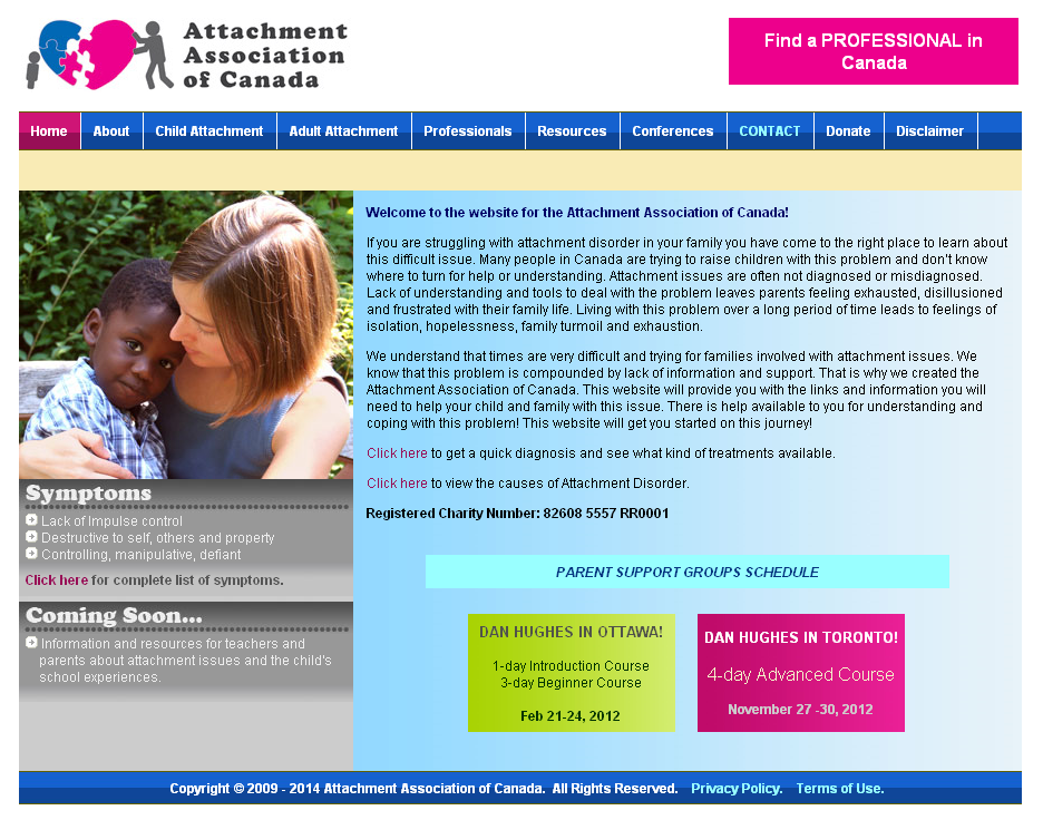 Attachment Association of Canada is a registered charity providing a central Canadian organization for the issue of attachment disorder. They are dedicated to raising the public understanding and awareness of attachment issues. They provide information and resources about attachment and trauma. They are working to create support networks for parents in as many communities as possible across the country. They are helping more therapists in Canada become qualified in this area so that they can provide services in their local communities. They are working to provide services and education to families and individuals dealing with the attachment issues.