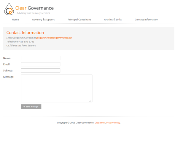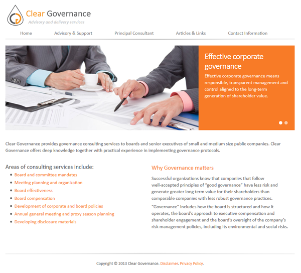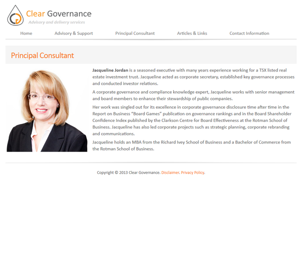 Clear Governance provides governance consulting services to boards and senior executives of small and medium size public companies. Clear Governance offers deep knowledge together with practical experience in implementing governance protocols. Jacqueline Jordan, the Principal Consultant of Clear Governance, is a seasoned executive with many years experience working for a TSX listed real estate investment trust. Jacqueline acted as corporate secretary, established key governance processes and conducted investor relations.