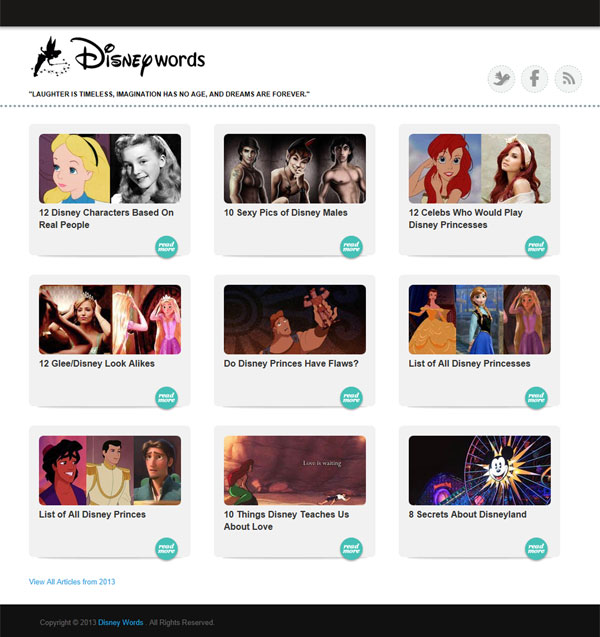 Disney Words started as a Twitter account that tweets Disney quotes every few hours. They have 2.5 millions followers to date including celebrities such as Miley Cyrus, Jordin Sparks, Thalia, Chloe Grace Moretz, Aaron Carter, Caridee English, Jordan Pruitt, and many more. In 2013, they expanded their brand by launching their website which contains interesting and fun Disney related articles. Sadly it had to close its door in early 2018.