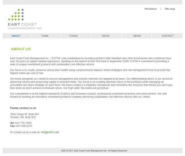East Coast Fund Management inc. (“ECFMI”) was established by founding partners John Schumacher and Mike MacBain who combined have over 50 years of capital markets experience. Building on the launch of their first fund in April 2010, ECFMI is committed to providing a suite of unique investment products with sustainable cost effective returns. Their commitment is to the highest standards of ethics and business conduct, professional investment practices and client service.