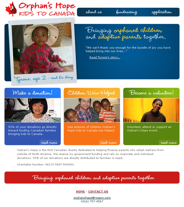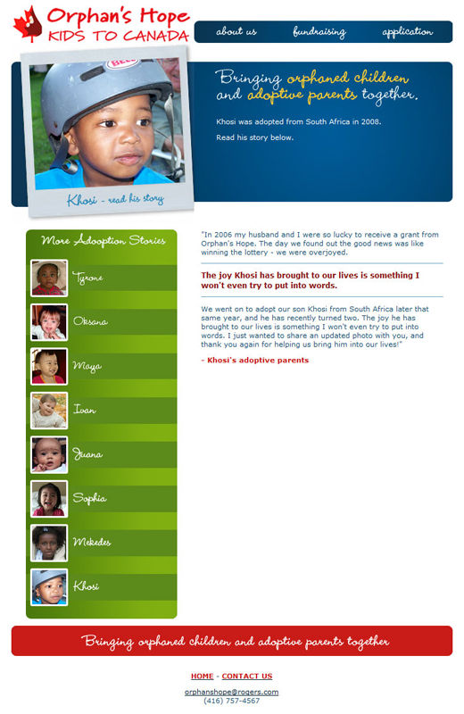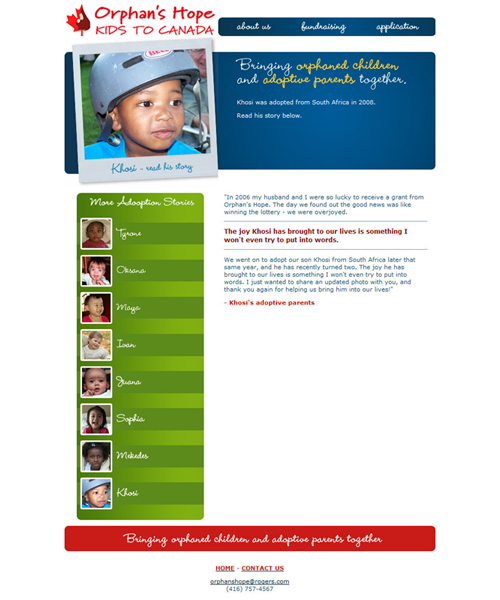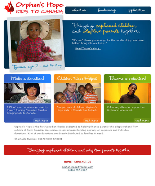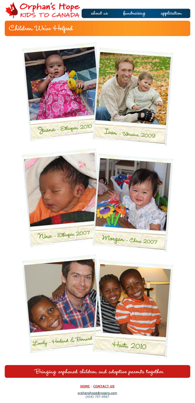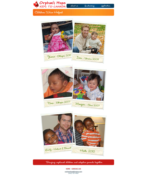 Orphan’s Hope Kids to Canada was co-founded in 2002 and it is the first Canadian charity dedicated to helping finance parents who adopt orphans from outside of North America. Disturbed by the incomprehensible number of needy orphans around the world coupled with the often substantial costs of international adoption, the founders set out to make a difference. Since then, the Board has expanded to include several other members, many of whom are adoptive parents themselves. The dream of Orphan’s Hope Kids to Canada is to ‘bring orphaned children and adoptive parents together’ in the greatest possible numbers.